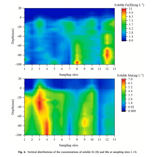 揭示氧化還原微界面:DO的垂向分布(圖2)顯示藻類區(qū)表層因光合作用富氧,但深層因藻類降解耗氧,導(dǎo)致Fe/Mn氧化物還原溶解,直接關(guān)聯(lián)W釋放。