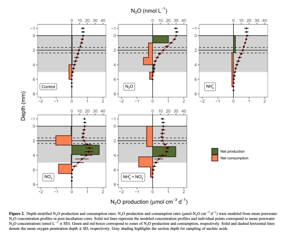 精準(zhǔn)定位N2O產(chǎn)消熱點(diǎn):通過孔隙水剖面(圖2),發(fā)現(xiàn)紅樹林沉積物表層0-2 mm存在微弱N2O生產(chǎn),但整體以深層(>2 mm)的強(qiáng)烈消耗為主,揭示產(chǎn)消過程的垂直分異。