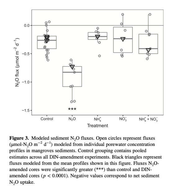 量化通量與模型驗(yàn)證:結(jié)合PROFILE模型,計(jì)算N2O通量(圖3)和產(chǎn)消速率,證明紅樹林的凈吸收(-0.22至-0.30 μmol m?2 d?1)與nosZII活性直接相關(guān)。