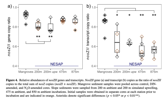 探究海洋沉積物中微生物群落動(dòng)態(tài)與N2O循環(huán)的關(guān)系,比較低氮紅樹林與高氮大陸邊緣沉積物的N2O代謝差異,闡明非典型nosZII基因在調(diào)控N2O消耗中的作用。