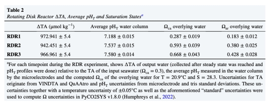 旋轉(zhuǎn)盤反應器實驗(RDR實驗):模擬海底流體動力學條件,測量文石與方解石混合沉積物的堿度通量變化(表2)。