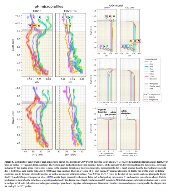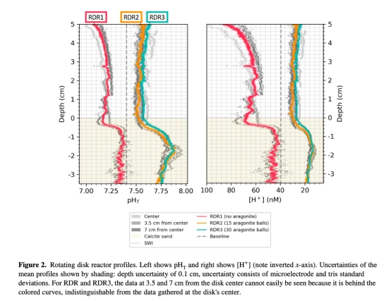比色皿實驗(CUV實驗):在無流動條件下,通過丹麥Unisense微電極測量孔隙水pH的微剖面(圖4),結合成巖模型(RADI模型)解析文石與方解石的溶解/沉淀速率。