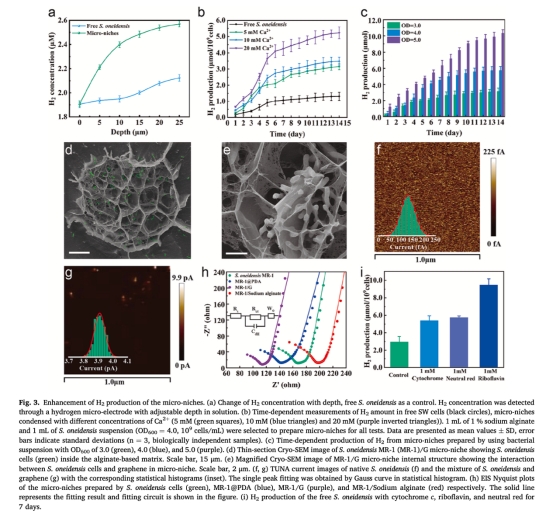 通過Unisense微電極測得的氧氣濃度數(shù)據(jù)(圖2h)顯示,微生態(tài)位內(nèi)部深度25μm處氧氣濃度趨近于零,表明呼吸代謝成功創(chuàng)造了缺氧環(huán)境。這一數(shù)據(jù)直接驗證了微環(huán)境設(shè)計的核心機制——缺氧是氫酶催化產(chǎn)氫的必要條件。此外,氧化還原電位隨深度降低(圖2i)進一步表明微環(huán)境內(nèi)部形成了強還原性微區(qū),為產(chǎn)氫反應(yīng)提供了熱力學(xué)驅(qū)動力。這些數(shù)據(jù)不僅證實了理論假設(shè),還為優(yōu)化微環(huán)境結(jié)構(gòu)(如細(xì)胞密度、材料導(dǎo)電性)提供了實驗依據(jù)。
