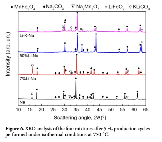 該研究探討了用不同共晶/共析堿金屬碳酸鹽混合物替代鈉錳鐵氧體熱化學(xué)水分解循環(huán)中的Na?CO?的效果。實驗表明,使用共析混合物(Li?.??Na?.??)?CO?時,首次循環(huán)后氫氣生成速度更快,但所有混合物的氫氣產(chǎn)量隨循環(huán)次數(shù)顯著下降。研究發(fā)現(xiàn),碳酸鹽的部分熔化促進(jìn)離子擴(kuò)散,但熔融碳酸鹽導(dǎo)致燒結(jié)現(xiàn)象加劇,降低循環(huán)可逆性。純Na混合物表現(xiàn)出最高的氫氣生產(chǎn)可逆性,而高Li或含K的混合物在首次循環(huán)后幾乎無氫氣生成。