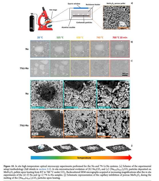 原位光學(xué)顯微術(shù):觀察熔融碳酸鹽對多孔MnFe?O?的潤濕行為(圖10)。