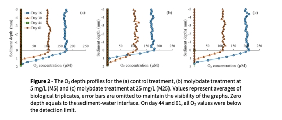 鉬酸鹽(尤其是25 mg/L劑量)顯著降低沉積物表層H?S濃度,將高硫區(qū)推向更深層(圖3),延緩硫化物向水體擴(kuò)散(圖1b)。