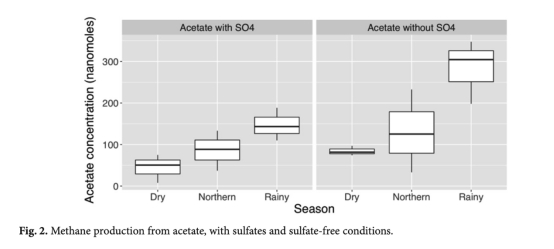 雨季的低鹽度、更負(fù)的氧化還原電位(Eh)和更高有機(jī)質(zhì)含量促進(jìn)了產(chǎn)甲烷作用。