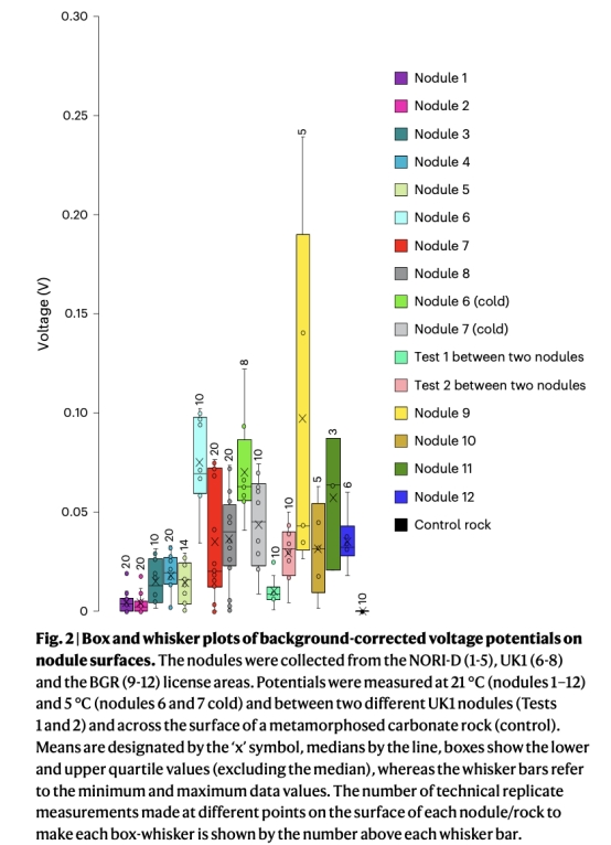 電壓數(shù)據(jù)(圖2):為“地質(zhì)電池”假說提供直接證據(jù),揭示多金屬結核的電化學活性。