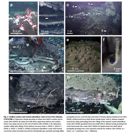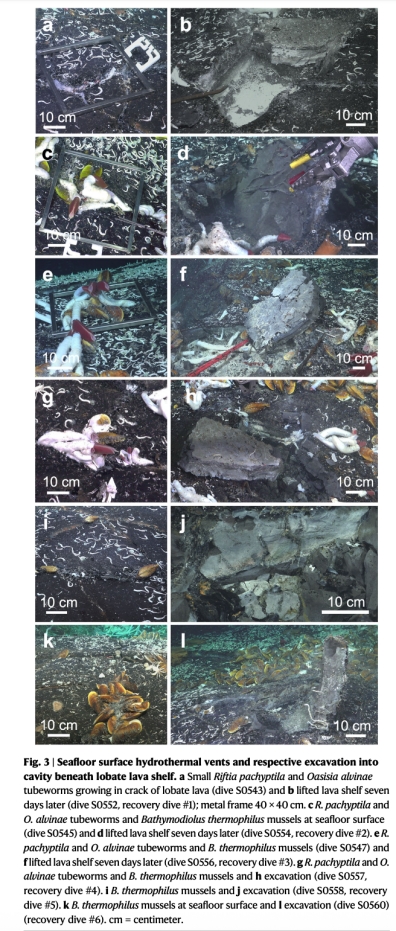 該研究首次報(bào)道在深海熱液噴口下方的淺層海底地殼中發(fā)現(xiàn)了成年管蟲(如Oasisia alvinae和Riftia pachyptila)及其他熱液噴口特有動(dòng)物。這些動(dòng)物通過(guò)地殼內(nèi)的流體循環(huán)系統(tǒng)擴(kuò)散,幼蟲可能通過(guò)海水與熱液混合的“補(bǔ)給區(qū)”進(jìn)入地下洞穴并定居。這一發(fā)現(xiàn)表明海底表面與地殼內(nèi)部的動(dòng)物群落是連通的,擴(kuò)展了已知的動(dòng)物棲息范圍,并對(duì)熱液噴口的化學(xué)通量測(cè)量和生態(tài)保護(hù)提出了新見(jiàn)解。