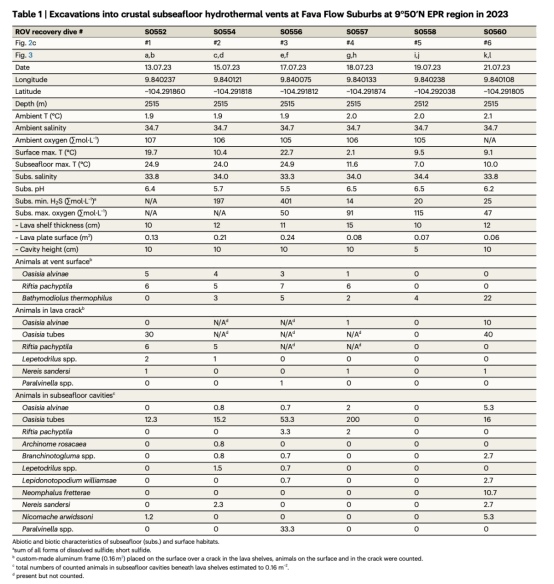 動(dòng)物分布數(shù)據(jù)(圖2d-h,圖3):顯示O. alvinae和R. pachyptila在洞穴內(nèi)的密集分布,表明地殼內(nèi)部是幼蟲擴(kuò)散和成體棲息的關(guān)鍵區(qū)域。