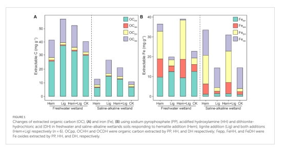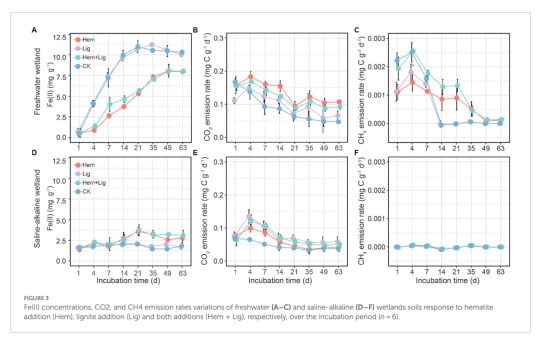 研究通過(guò)淡水濕地(富碳鐵)和鹽堿濕地(貧碳鐵)的厭氧培養(yǎng)實(shí)驗(yàn),探究赤鐵礦(Hem)和褐煤(Lig)添加對(duì)土壤有機(jī)碳平衡的影響。結(jié)果表明:Lig通過(guò)促進(jìn)鐵結(jié)合有機(jī)碳(Fe-OC)形成導(dǎo)致凈碳積累(淡水濕地:5.9±3.6 mg g?1;鹽堿濕地:8.3±3.2 mg g?1),而Hem通過(guò)改變微生物群落結(jié)構(gòu)顯著增加有機(jī)碳礦化(尤其在淡水濕地)。結(jié)晶態(tài)鐵氧化物單獨(dú)添加會(huì)增強(qiáng)碳礦化,但老碳(富含芳香族和烷基化合物)能促進(jìn)Fe-OC形成并提高碳持久性。