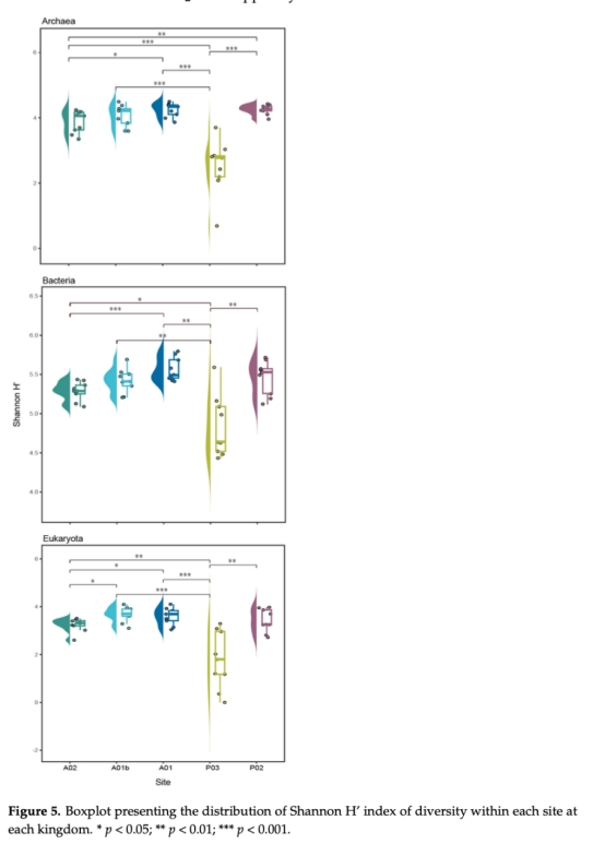 微生物多樣性(圖5):Shannon指數(shù)顯示細菌多樣性最高,P03站點多樣性最低,提示該區(qū)域環(huán)境壓力顯著。