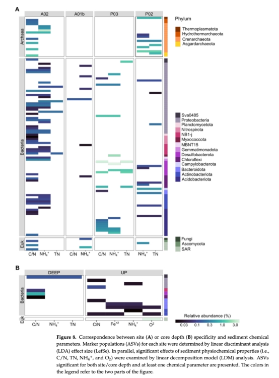 化學參數(shù)(C/N比、NH4+濃度)與特定微生物類群顯著相關(如Desulfobacteria與高C/N比沉積物)。