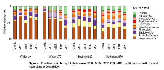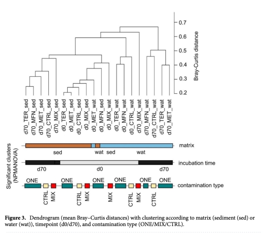 研究分析了三種微污染物(二甲雙胍、異丙甲草胺、特丁津)單獨(dú)或混合存在時(shí)在沉積物-水界面微宇宙中的消散過(guò)程及其對(duì)原核生物群落的影響。結(jié)果顯示,二甲雙胍和異丙甲草胺在70天內(nèi)完全消散,而特丁津具有持久性;混合污染未顯著改變單一污染物的消散速率。微生物群落結(jié)構(gòu)的變化主要由基質(zhì)(沉積物/水)和時(shí)間驅(qū)動(dòng),但混合污染中的異丙甲草胺和特丁津?qū)μ囟?lèi)群表現(xiàn)出協(xié)同或拮抗的非加性效應(yīng)。