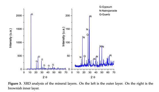 礦物組成:外層為石膏,內(nèi)層為鈉鐵礬(圖3)。