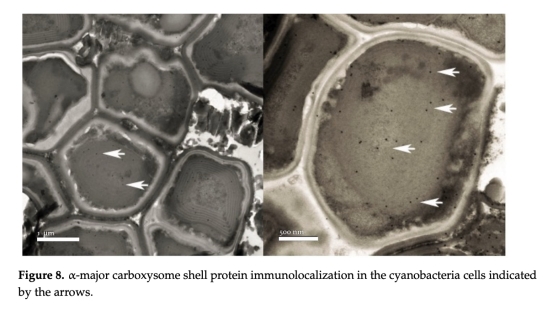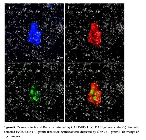 微生物結(jié)構(gòu)與多樣性分析:利用掃描電鏡(SEM,圖4-5)、透射電鏡(TEM,圖6-8)觀察細(xì)胞超微結(jié)構(gòu);通過免疫定位(α-羧酶體蛋白)和熒光原位雜交(CARD-FISH,圖9)確認(rèn)藍(lán)藻存在。
