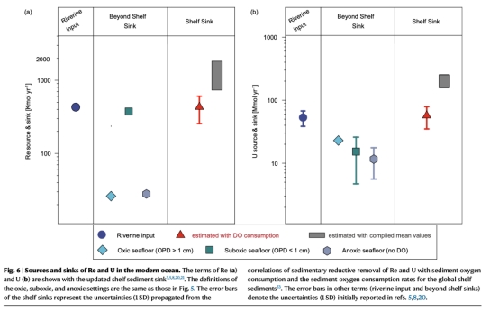 全球陸架Re匯(431±175 Kmol/yr)與河流輸入相當(dāng),U匯(57±22 Mmol/yr)超現(xiàn)有深海匯總和(圖6),徹底改變元素預(yù)算認知。