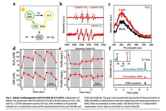 該過程依賴光合產(chǎn)物(有機(jī)物、O2、ROS)和鐵介導(dǎo)的氧化還原反應(yīng),挑戰(zhàn)了傳統(tǒng)厭氧產(chǎn)甲烷理論。