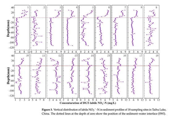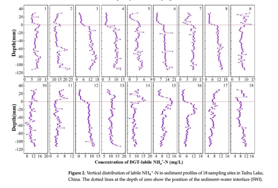 原位觀測:在太湖18個采樣點(diǎn)采集沉積物,使用DGT和HR-Peeper技術(shù)獲取SWI處NH4+-N、NO3--N的高分辨率垂直分布數(shù)據(jù)(圖2、3)。