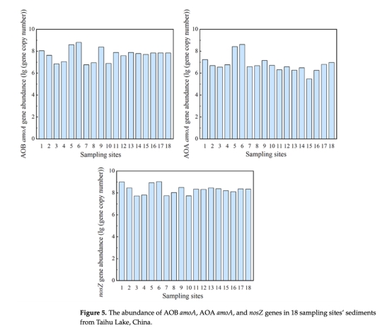 機(jī)制解析:結(jié)合功能基因(AOB amoA、AOA amoA、nosZ)豐度(圖5)和DOM組分分析,闡明硝化-反硝化耦合過程。