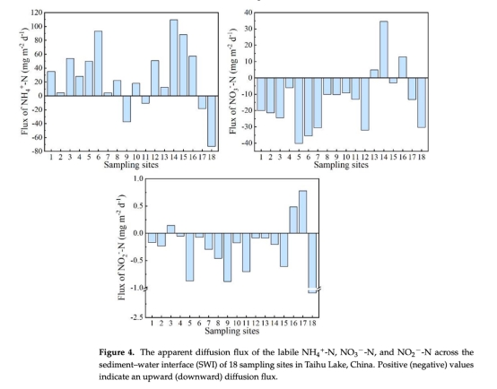 藻類分解使沉積物從NH4+-N的“匯”轉(zhuǎn)為“源”,NO3--N和NO2--N的“源”轉(zhuǎn)為“匯”(通量方向反轉(zhuǎn))。