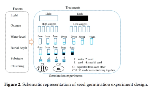研究思路1. 萌發(fā)實(shí)驗(yàn):單因素設(shè)計(jì),分別測試光、氧、水位(0–40 cm)、埋深(0–4 cm)、基質(zhì)(水、沙、泥、混合)及密度(單粒vs. 50粒)對萌發(fā)率的影響(圖2)。