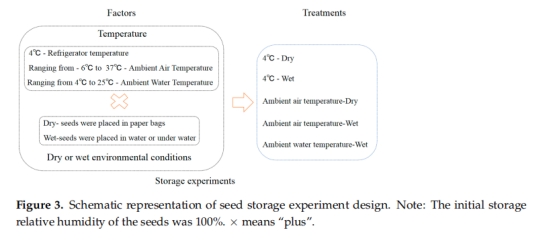 2. 儲(chǔ)存實(shí)驗(yàn):比較5種儲(chǔ)存條件(4°C干/濕、常溫干/濕、環(huán)境水溫濕沙)對種子活力(萌發(fā)率)、水分含量及呼吸速率的影響(圖3)。