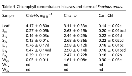 色素分析:測(cè)定葉、莖、樹皮和木材的葉綠素和類胡蘿卜素含量(表1)。