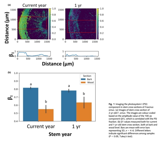 本研究通過微傳感器技術(shù)和熒光壽命成像顯微鏡(FLIM),首次系統(tǒng)評(píng)估了木本植物(以花楸樹為例)莖部不同組織(樹皮和木材)的光合作用能力及其對(duì)氧氣釋放的貢獻(xiàn)。研究發(fā)現(xiàn),光照條件下莖部整體、樹皮和木材均能產(chǎn)生氧氣,且年輕莖的氧氣產(chǎn)量和暗呼吸速率高于老莖。樹皮是莖部凈氧氣生產(chǎn)的主要貢獻(xiàn)者,但木材葉綠體也具有光合活性。FLIM分析顯示木材葉綠體的PSI比例低于樹皮,表明莖部葉綠體能夠適應(yīng)內(nèi)部光譜環(huán)境。研究揭示了莖部光合作用在維持局部氧氣平衡中的作用。