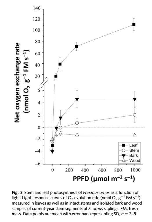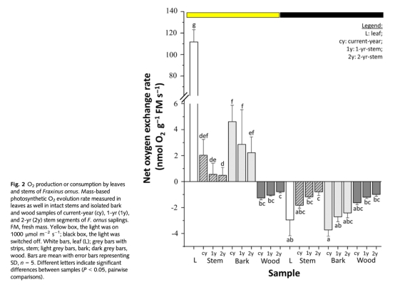 光照下當(dāng)年生莖整體凈氧氣產(chǎn)量為2.0 nmol O2/g FM/s,樹皮貢獻(xiàn)主要部分(1.2 nmol O2/g FM/s),木材光合作用僅補(bǔ)償其呼吸消耗的20%。