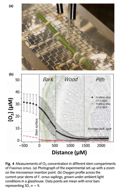 氧氣交換速率測(cè)量:利用微傳感器技術(shù)測(cè)定黑暗和光照條件下莖部整體、樹皮和木材的凈氧氣交換速率(圖2、3)。