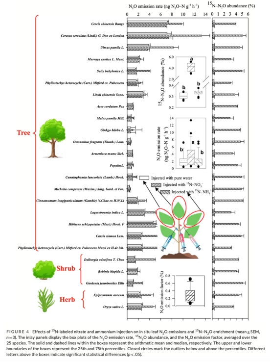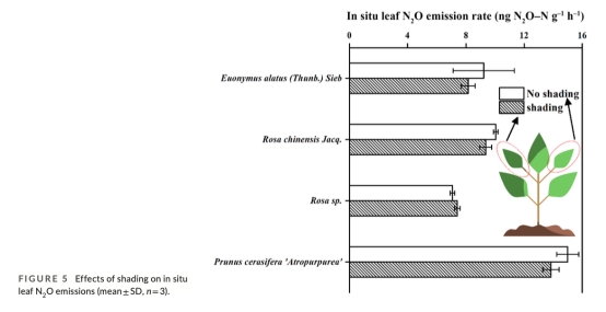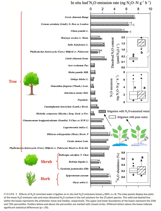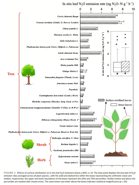 所有測(cè)試植物在自然條件下均通過(guò)葉片排放N?O,季節(jié)平均速率3.2-9.2 ng N?O-N/g干葉/h。