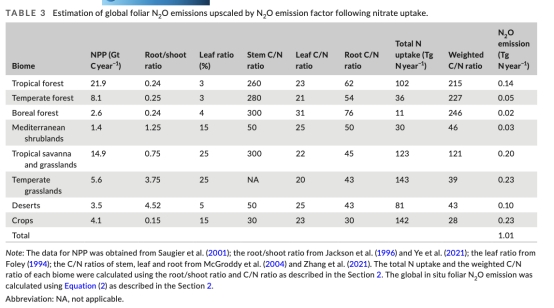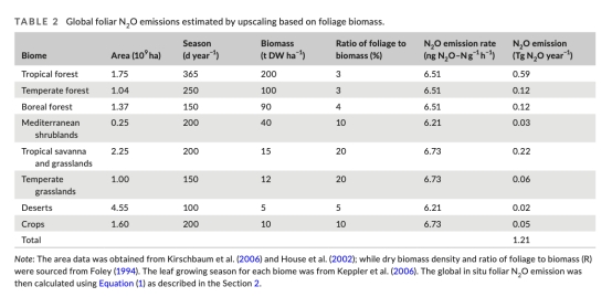 全球葉片N?O排放估算為1.21 Tg(基于生物量)至1.01 Tg(基于硝酸鹽吸收),占當(dāng)前全球年排放量的6%-7%。