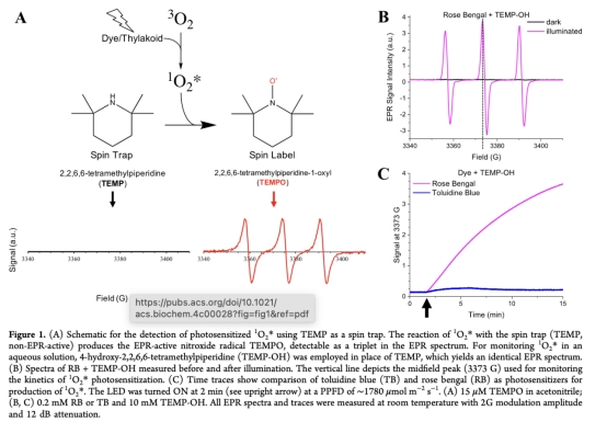 方法優(yōu)化:先在染料系統(tǒng)(如玫瑰紅RB和甲苯胺藍(lán)TB)中驗(yàn)證EPR自旋捕獲技術(shù)檢測(cè)1O?*的可行性(圖1B, 1C)。