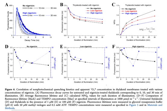 條件調(diào)控:通過添加解偶聯(lián)劑(nigericin)破壞跨膜質(zhì)子梯度,研究其對(duì)NPQ和1O?*動(dòng)態(tài)的影響(圖5C, 6E-F)。