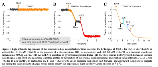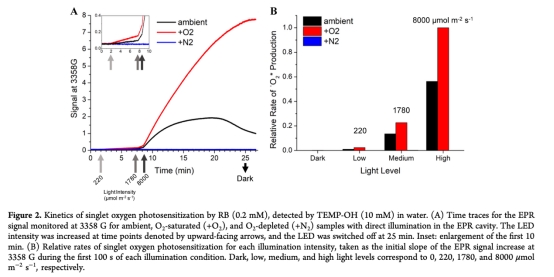 EPR信號(hào)動(dòng)力學(xué)(圖2A, 3B, 4):通過監(jiān)測(cè)TEMPO自由基的生成和衰減,量化1O?*濃度變化,驗(yàn)證光照強(qiáng)度和氧氣濃度對(duì)光敏化反應(yīng)的影響。