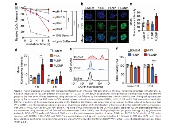 ROS水平:PLCNP處理的GBM細(xì)胞ROS強度是PLNP的2.1倍(圖4d)。