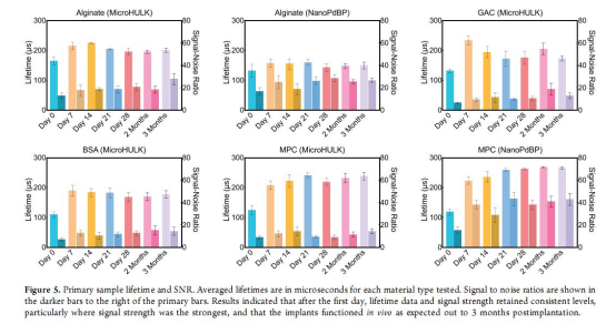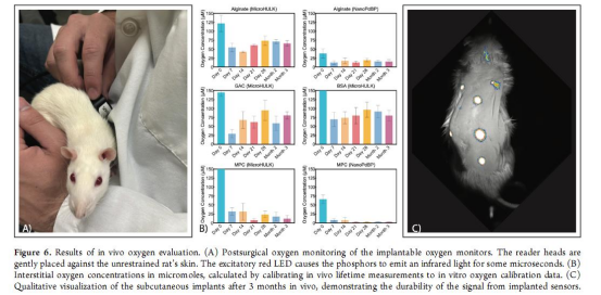 所有傳感器在體內均表現(xiàn)出穩(wěn)定的氧敏感性,信號持續(xù)超過三個月(圖5、圖6B)。
