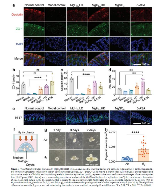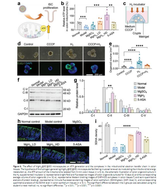 該論文開發(fā)了一種腸道靶向控釋氫氣的微膠囊(MgH2 EC ES),通過多層乳化法將MgH2顆粒封裝于乙基纖維素(EC)疏水網(wǎng)絡(luò)外層包覆腸溶材料Eudragit S100(ES)。該微膠囊在胃酸(pH 1.2)中穩(wěn)定,在腸道(pH 7.0)中通過ES溶脹和EC的緩釋作用實現(xiàn)持續(xù)產(chǎn)氫。在小鼠結(jié)腸炎模型中,高劑量(800 mg/kg)的MgH2 EC ES微膠囊治療效果優(yōu)于一線藥物5-ASA,顯著恢復(fù)結(jié)腸長度、黏膜屏障和線粒體能量代謝。機制研究表明,H?通過保護線粒體電子傳遞鏈復(fù)合物免受氧化損傷,增強腸道細胞的能量代謝以支持黏膜修復(fù)。