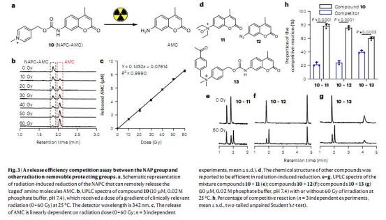 2. 機(jī)制驗(yàn)證:結(jié)合理論計(jì)算和實(shí)驗(yàn)(如自由基捕獲、UPLC-MS分析),揭示NAP通過捕獲e?aq觸發(fā)C-O鍵斷裂釋放功能分子的機(jī)制(圖2e-f,Extended Data Fig.1)。