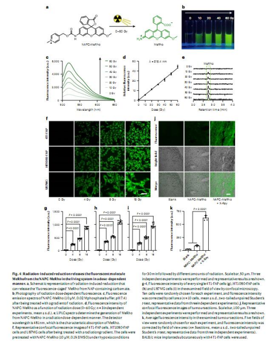 熒光探針驗(yàn)證:設(shè)計(jì)NAPC-AMC和NAPC-MeRho探針,驗(yàn)證其在細(xì)胞和腫瘤中的放療激活釋放(圖3-4)。