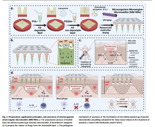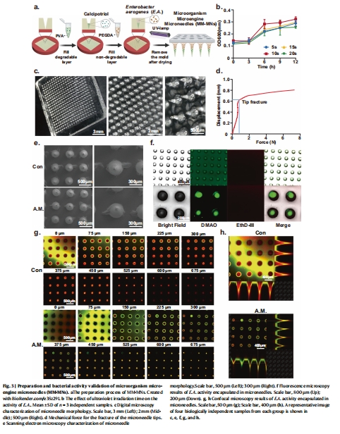 創(chuàng)新性:首次將活微生物作為“生物微引擎”整合至微針,實(shí)現(xiàn)主動(dòng)可控的藥物遞送。