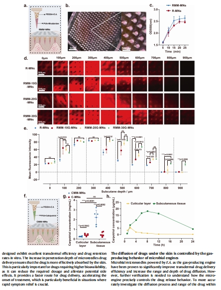 羅丹明B釋放實(shí)驗(yàn):微生物微針(RMM-MNs)釋放速率顯著高于傳統(tǒng)微針(R-MNs)(圖5c)。