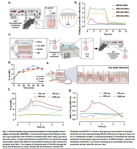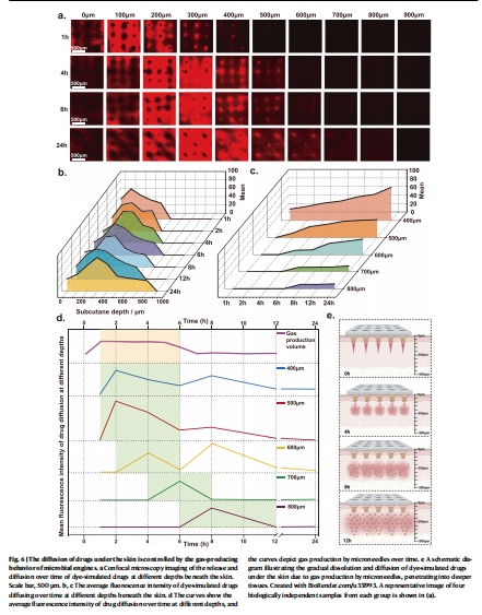 微針刺入皮膚后,E.A.利用葡萄糖持續(xù)產(chǎn)氣 → 氣體壓力推動(dòng)外層藥物溶解并深入組織(圖1b, 圖6e)。