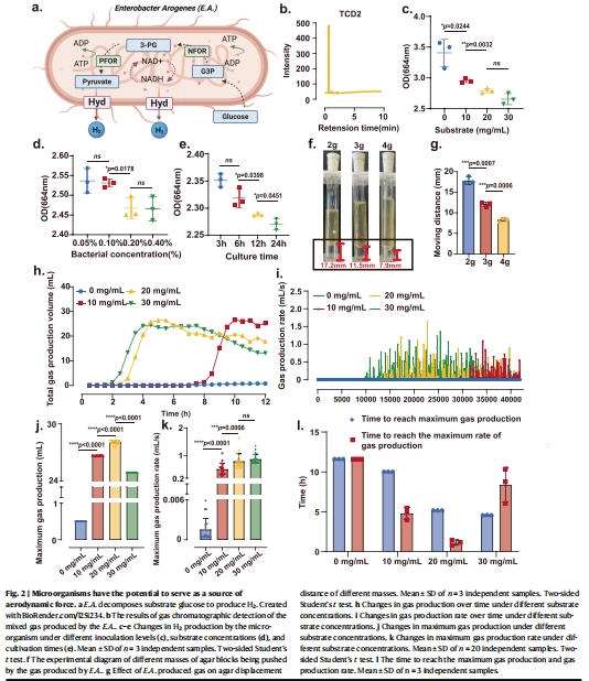 微生物在微針內(nèi)保持活性,通過(guò)發(fā)酵葡萄糖持續(xù)產(chǎn)氣(H?為主),形成可控推進(jìn)力(0.04 N)。