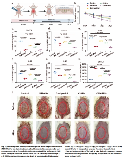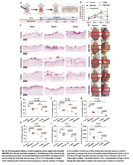 炎癥因子(IL-17A/F, IL-22等):CMM-MNs組顯著低于對(duì)照組(圖7c–h, 圖8e–j)。