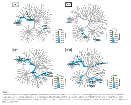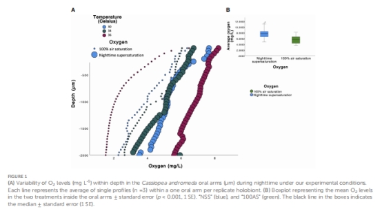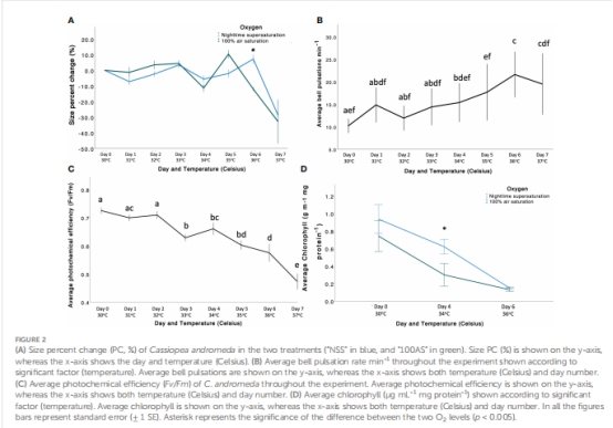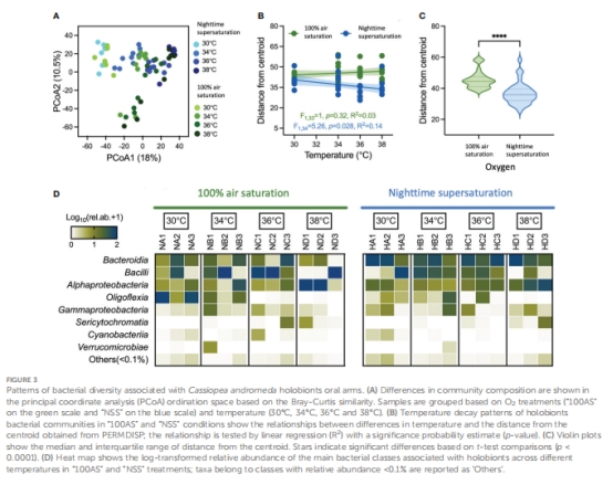 論文通過(guò)實(shí)驗(yàn)證明:氧氣過(guò)飽和(O? supersaturation)可增強(qiáng)倒立水母(Cassiopea andromeda)-蟲(chóng)黃藻(Symbiodiniaceae)共生體對(duì)中等升溫的抵抗力。在亞致死溫度下(≤36°C),夜間氧氣過(guò)飽和(NSS組)使水母體型縮小減輕約10.37%,葉綠素a損失減少42.73%(至34°C),并富集有益菌群,提升微生物組穩(wěn)定性。超過(guò)34-36°C后,熱應(yīng)激效應(yīng)主導(dǎo),氧氣效益消失。