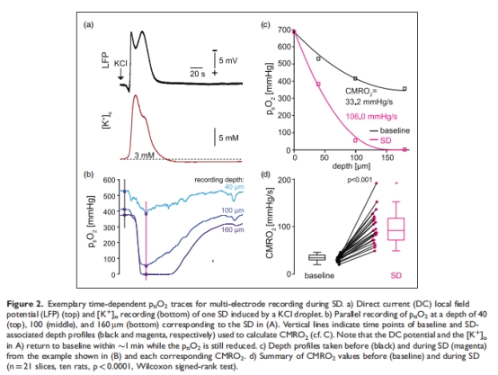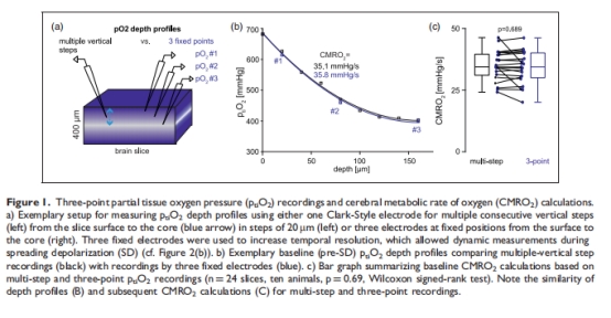 動(dòng)態(tài)監(jiān)測(cè)CMRO?:通過三固定電極同步記錄不同深度的ptiO?(圖1a),首次實(shí)現(xiàn)SD期間瞬態(tài)CMRO?峰值的捕獲(傳統(tǒng)單電極法無法做到)。