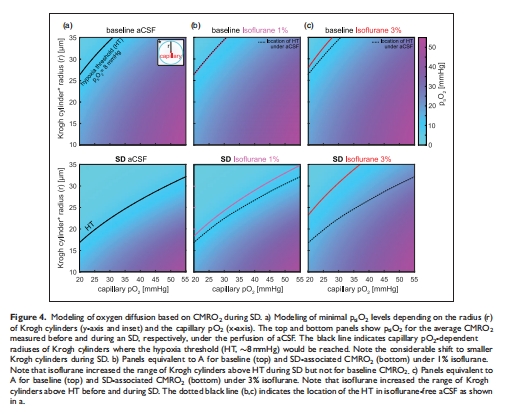 ptiO?數(shù)據(jù)驅(qū)動(dòng)Krogh模型(圖4),證明SD時(shí)需提升毛細(xì)血管pO?(如通過血管舒張)以預(yù)防缺氧,而異氟醚可擴(kuò)大安全氧合范圍。