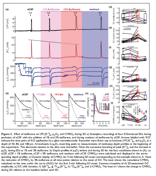 - 異氟醚(3%)將缺氧切片比例從58%降至17%(圖3b)。 圖2b; 圖3a, 3b 直接證實(shí)SD導(dǎo)致缺氧;異氟醚通過降低CMRO?維持氧分壓。